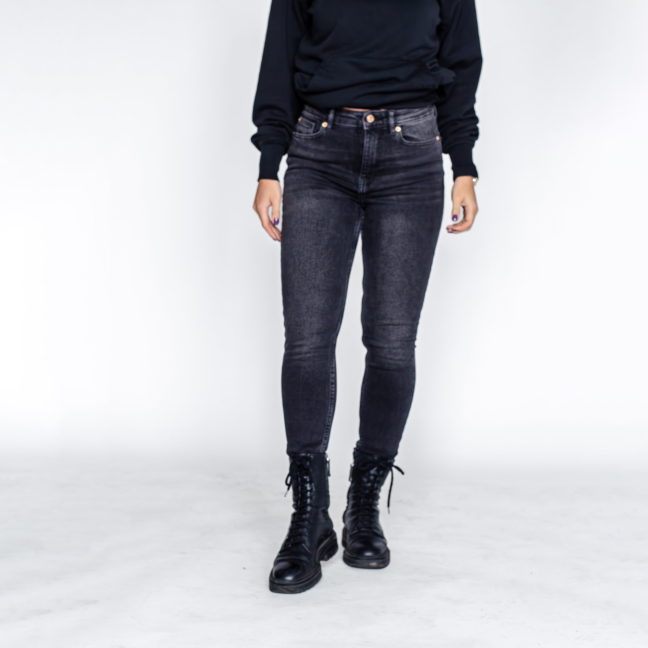 These high-waisted black skinny jeans are the perfect addition to your wardrobe for a trendy and edgy look. The acid wash finish gives them a unique, dark grey marbled appearance, while the high-rise fit and stretchy denim fabric provide a comfortable and flattering silhouette.