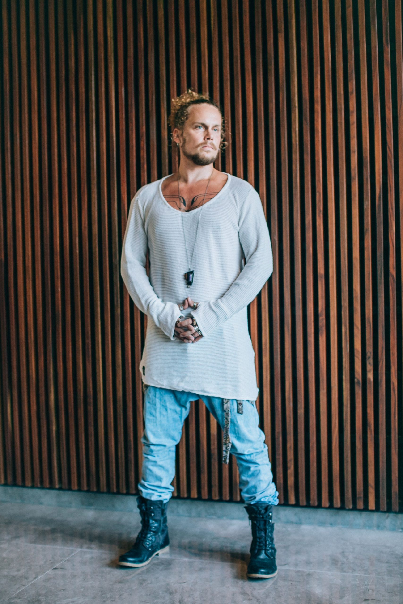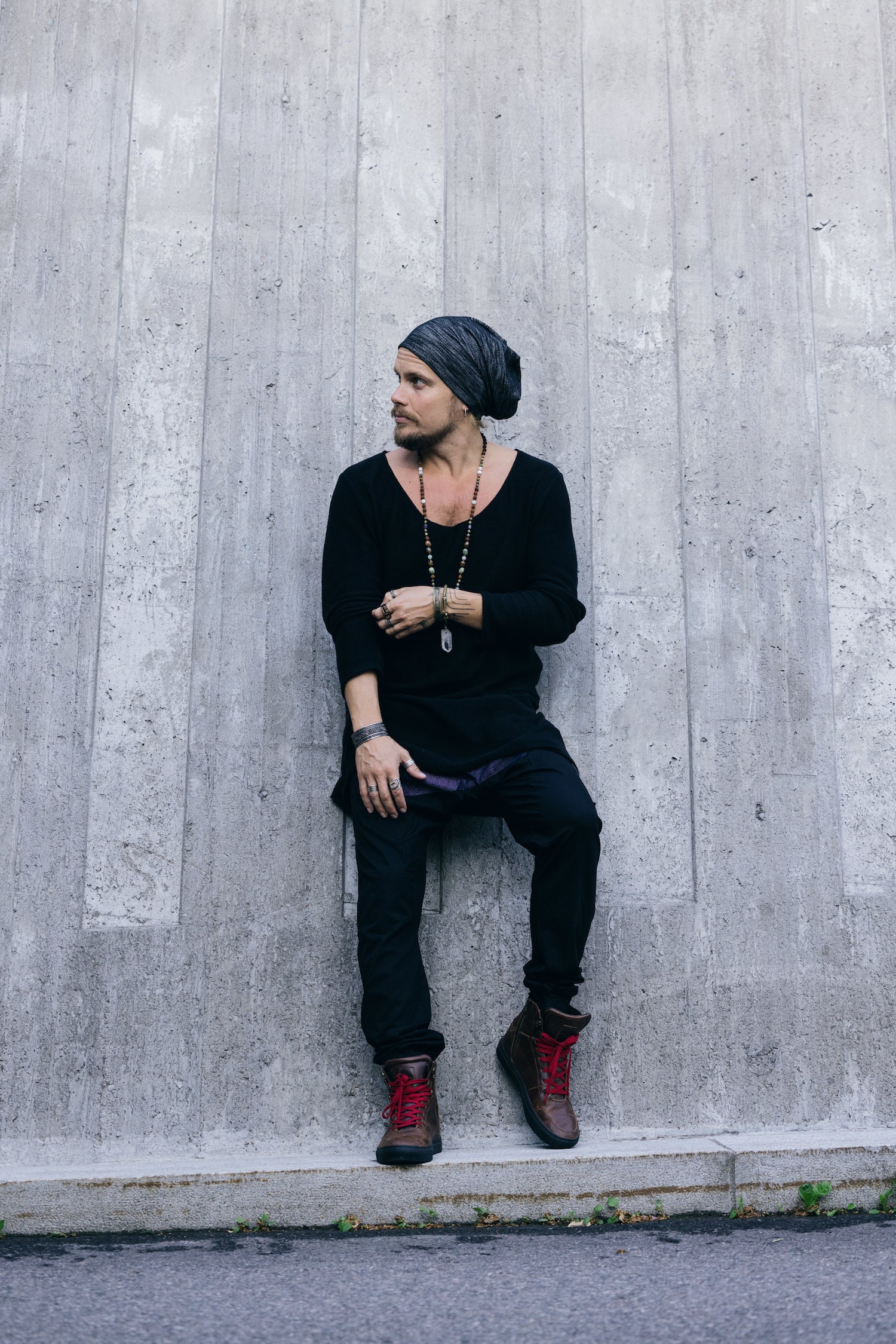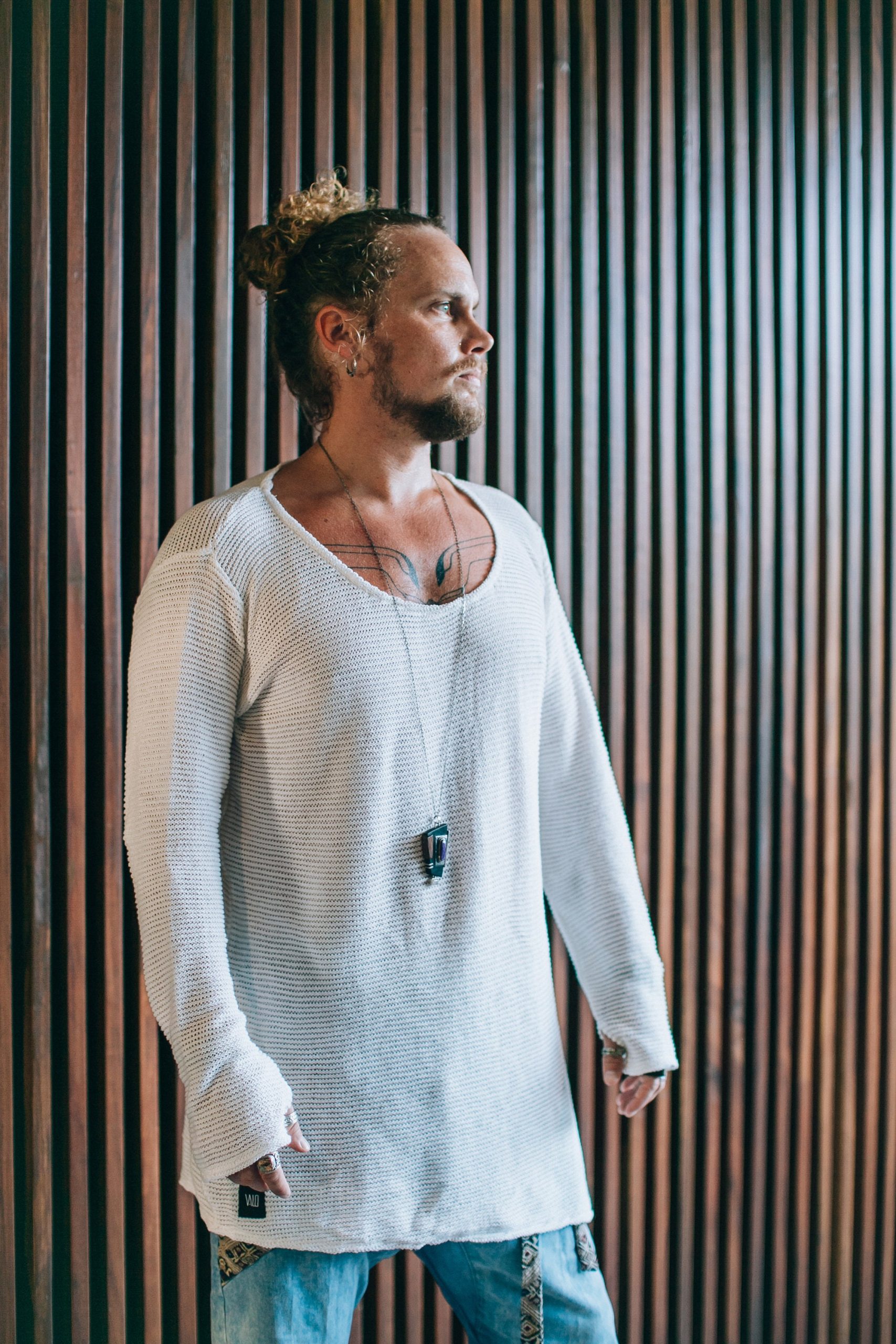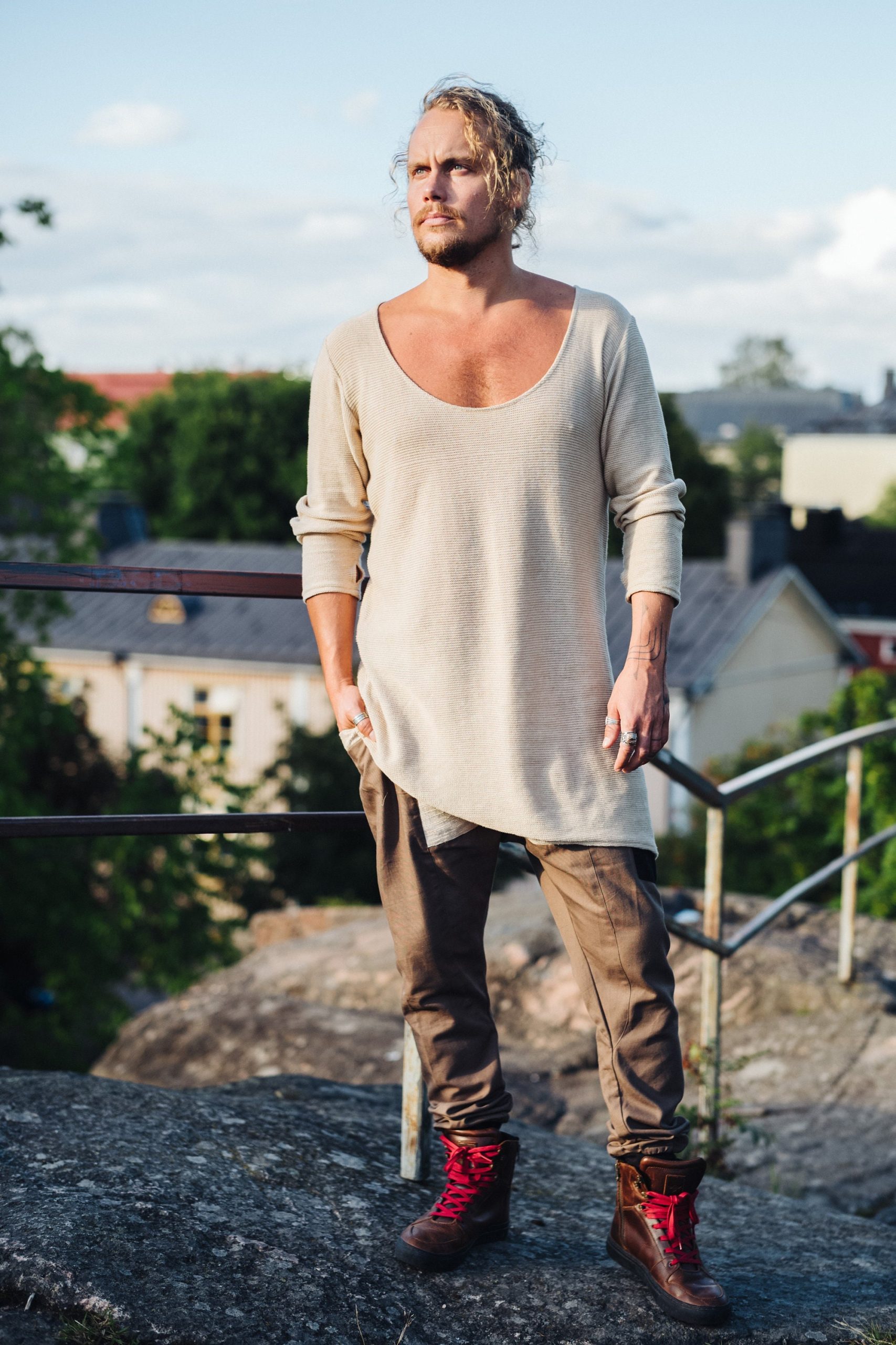 Classical oversized round neck long sleeve, with asymmetric cut on the bottom, long arms with thumb holes in the cuffs. Perfect sweater for autumn and spring, or chiller summer days. Perfect for layering as well as worn alone for showing eg. chest and neck tattoos. Thumb hole function keeps wrists warm. Combines brilliantly with any style!